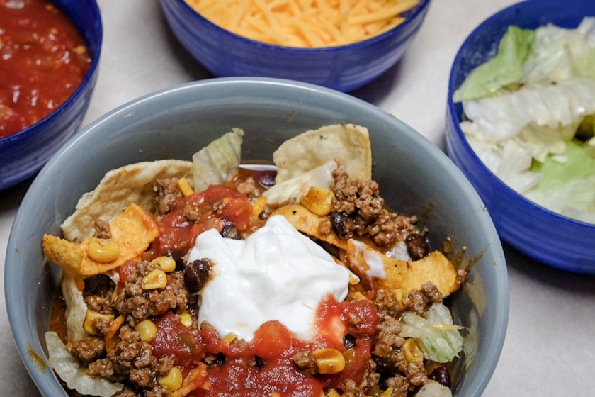 Put your Taco mix in the bowl. Be generous, you’ll have plenty. Add Lettuce, Cheese, Sour Cream and Taco Sauce. Sprinkle a little bit of Chili Cheese Fritos on top (yes, it makes a difference – especially for the kids).