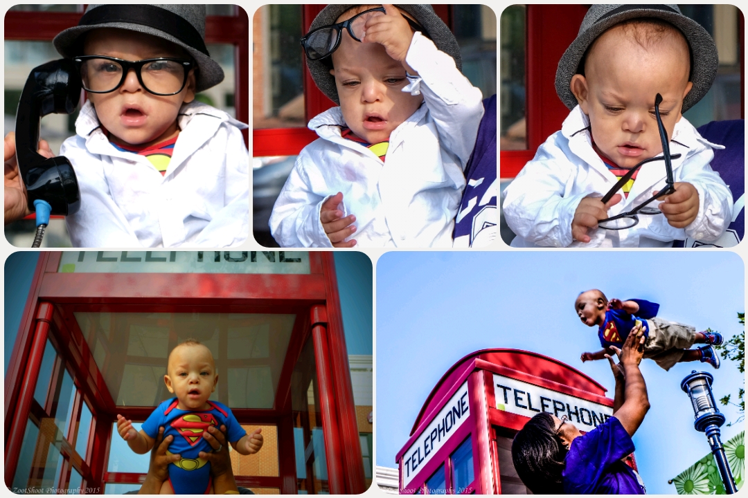 My plan was to take shots of him posed “in flight” with his father holding him up.  I would take several shots and edit his father out of the photo to give the appearance of him flying alone, out of the booth.  We were going to take a few shots beforehand, with him removing his shirt and glasses while in the booth like Clark Kent.
