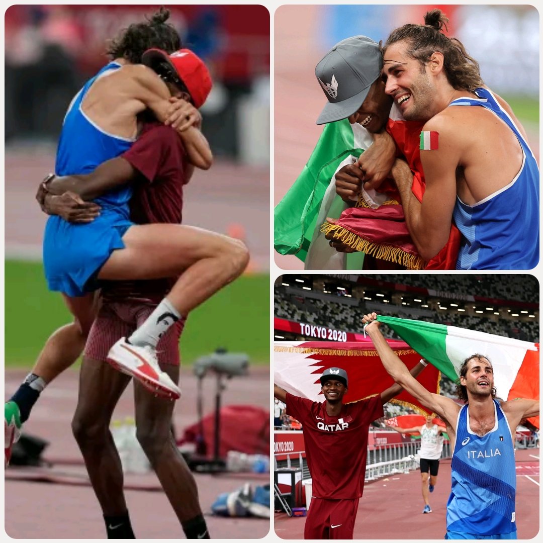 High Jump competitors Gianmarco Tamberi of Itali and Mutaz Essa Barshim of Qatar jumped their way to a medal-seeking deadlock. The judge asked the two if they wanted to compete in a tie-breaking jump-off.