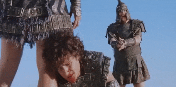 To no one’s surprise, Menelaus eventually and seriously wounds Paris, cutting deeply into his leg, causing him to fall. Paris weakly attempts to fight back but is punched in the mouth and knocked to the ground again. After retreating backwards a few steps, he looks up as Menelaus reaches upward with his sword to deliver the killing stroke.
