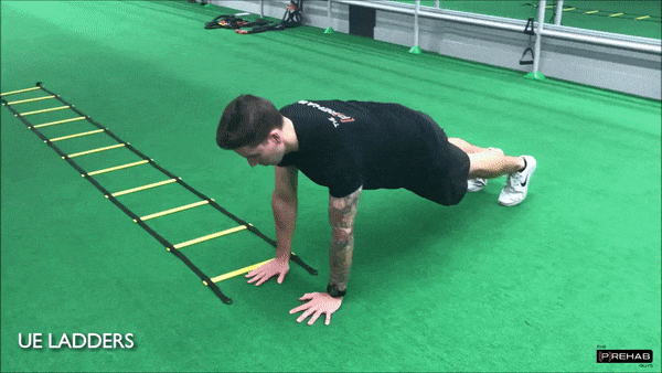 Exercise #4: The Upper Extremity Ladder (ok, let’s call this one “Death Crawl”) An Agility or Military rope ladder is laid in front of you from left to right, end to end. Your job is to get down on your hands and feet, perpendicular to it at the left (or right) end in the Push Up position. You place your left hand on the floor in the space between the first and second rungs, right hand between the second and third. From there, you walk your hands through the rungs; right hand – then left hand; right, then left until you reach the end. Then, you move in the opposite direction, returning to your starting point, only using your hands and toes to move you along.
