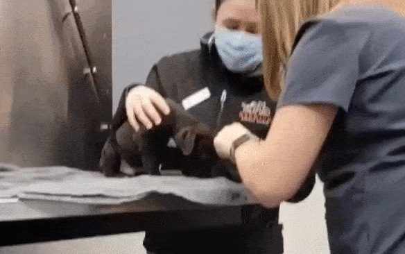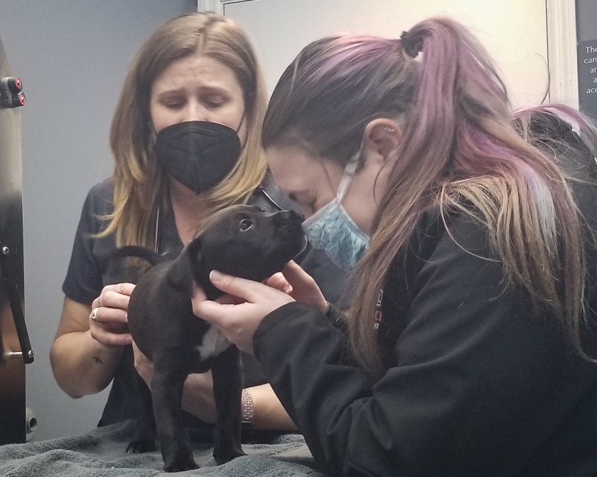 After taking down some basic information, she spirited him off to be weighed, then returned shortly with the veterinarian for his first exam, giving him even more love.