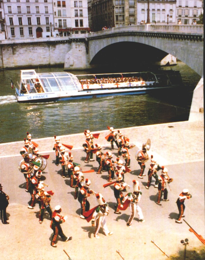 A small portion of the band, performing on the Seine River before the big parade. I was in the unit playing at the Eiffel Tower.